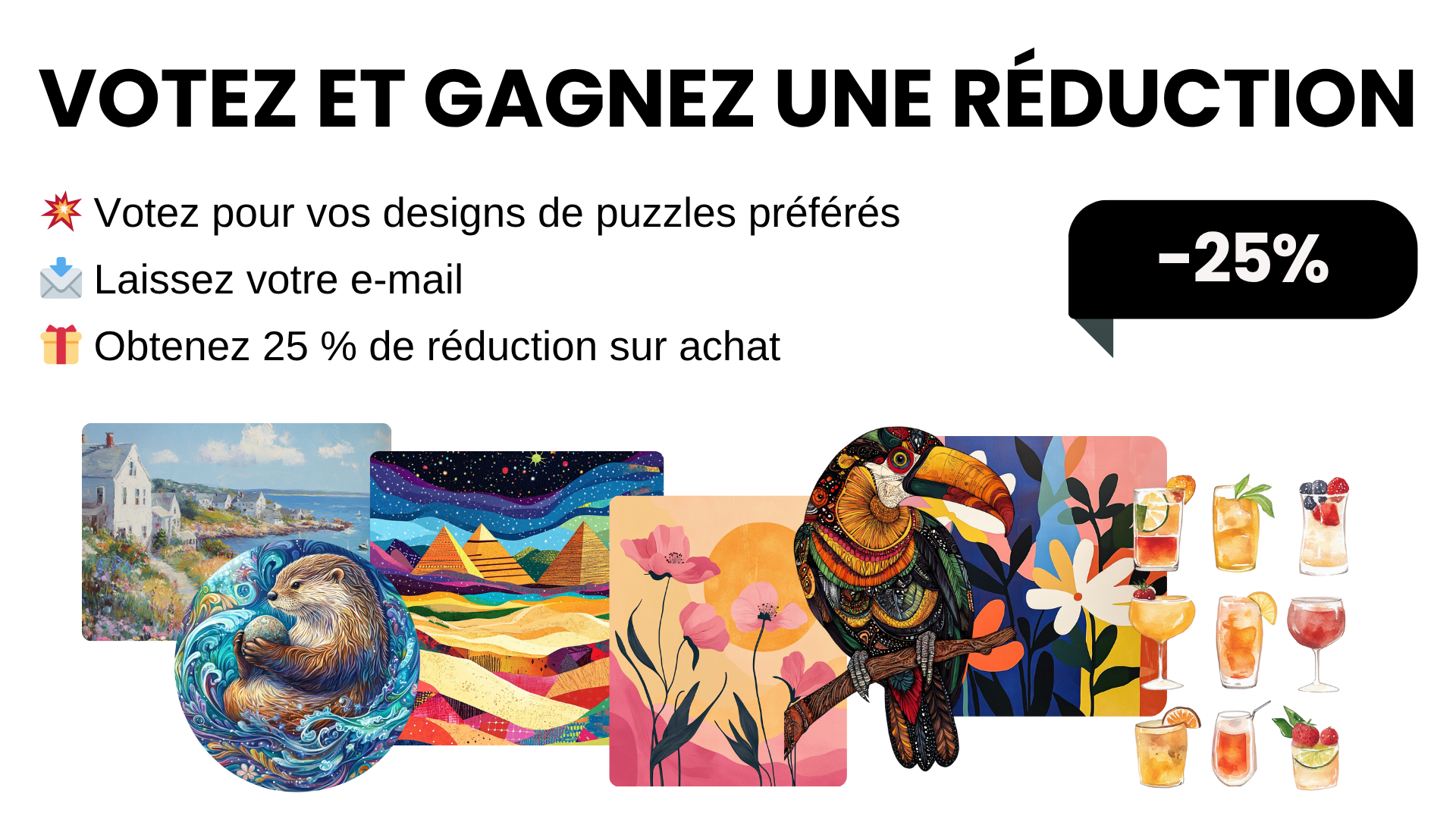 Vos choix de puzzles = nos prochaines créations ! Votez pour vos préférés et contribuez à façonner l'avenir des puzzles. Créons quelque chose d'extraordinaire ensemble ! 🧩 🙌